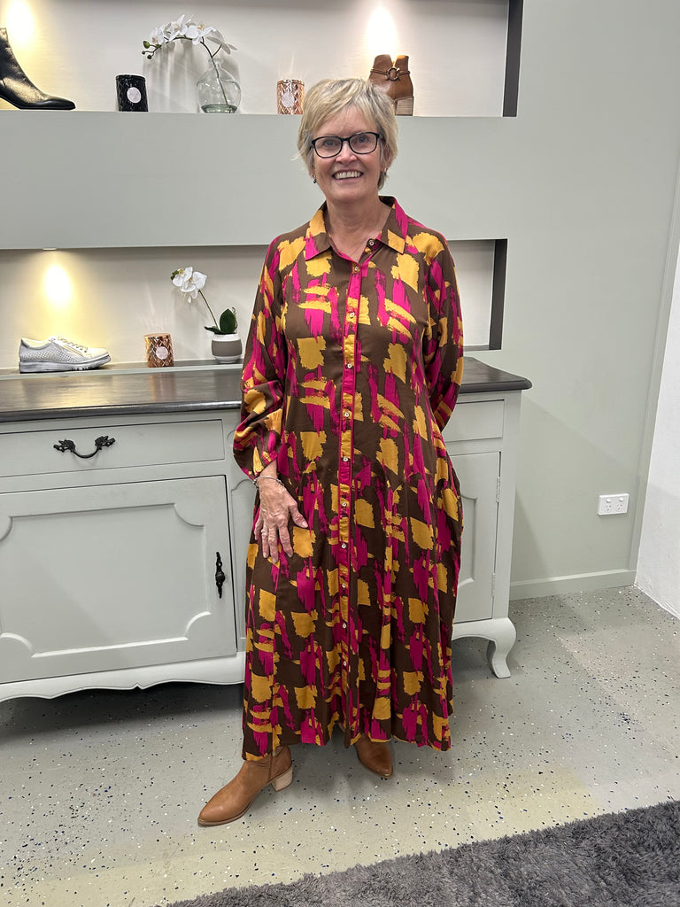 Make a statement with Outfit By Liz's Panel Detail Shirt Dress. Featuring a modern paint stroke design, this dress adds a touch of art to your wardrobe. The unique panel detail creates a flattering silhouette, making it a versatile choice for any occasion. Prepare to turn heads with this quirky and stylish piece!