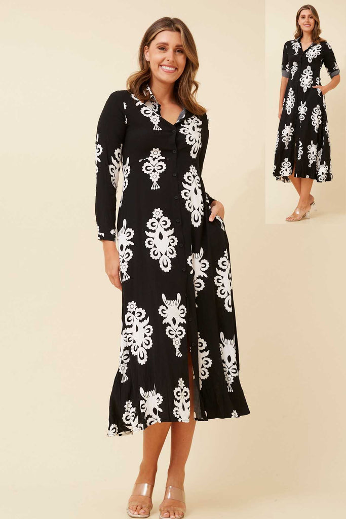 Long Sleeve Printed Shirt Dress - Black