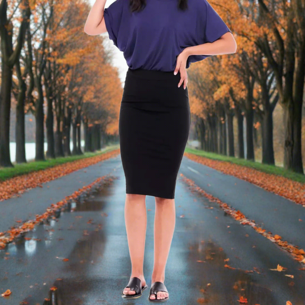 Introducing the perfect blend of comfort and style - our Pencil Skirt. Designed with a flattering pencil skirt fit, an elasticated waistband for all-day ease, and a straight hemline, this skirt is the ideal choice for a relaxed, fun, and fashionable look. Crafted from cotton with just the right amount of stretch, it's a must-have addition to your wardrobe.