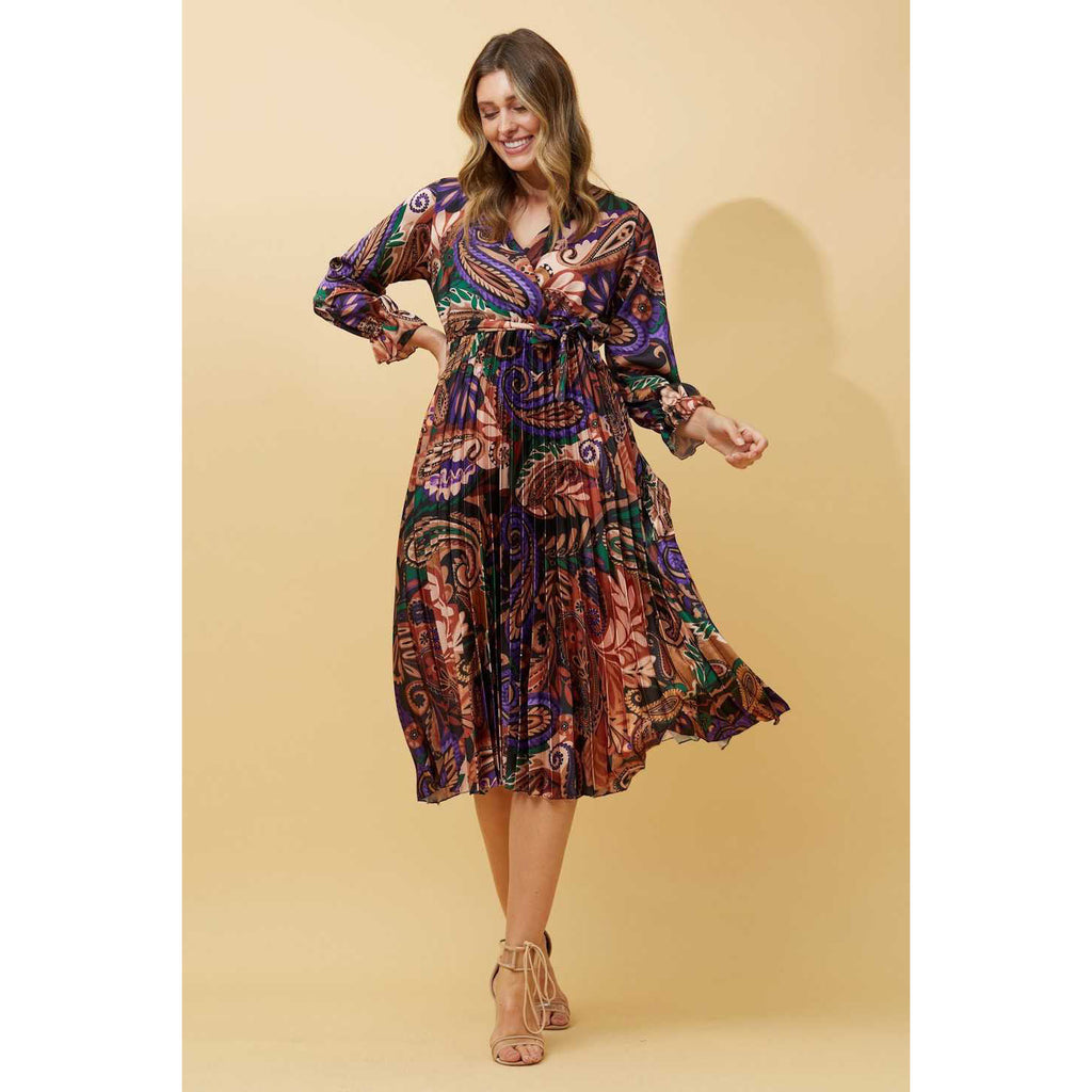 Long Sleeve Midi Dress With Belt - Multi Purple