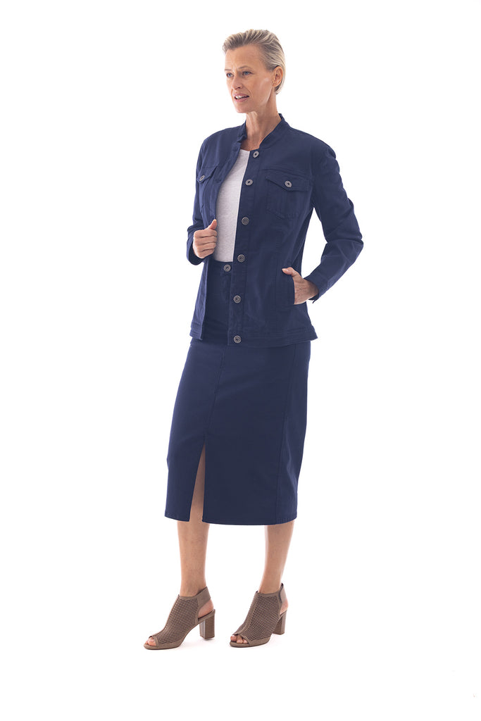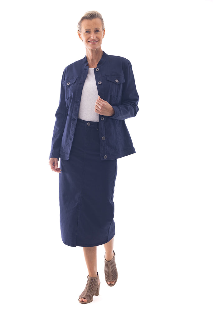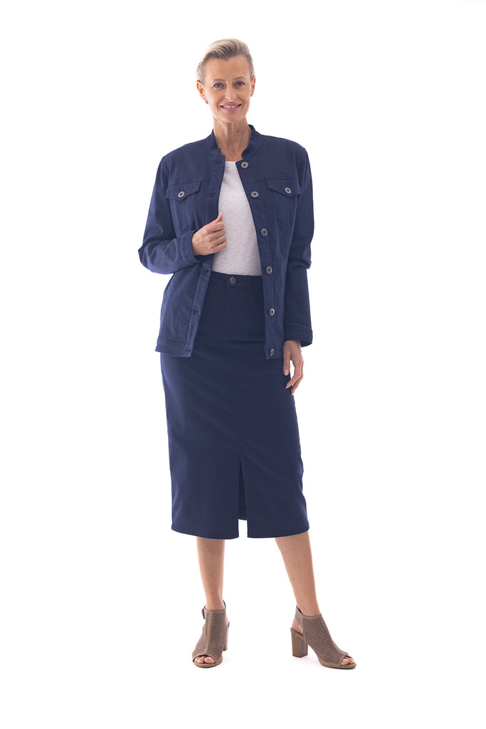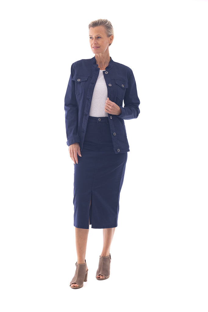 A Jean Jacket from Cafe Latte is a stylish and comfortable piece of clothing that features several design elements. The jacket has a Mandarin collar, which is a short, stand-up collar typically seen on Chinese-inspired garments. The collar adds a touch of elegance and sophistication to the jacket.