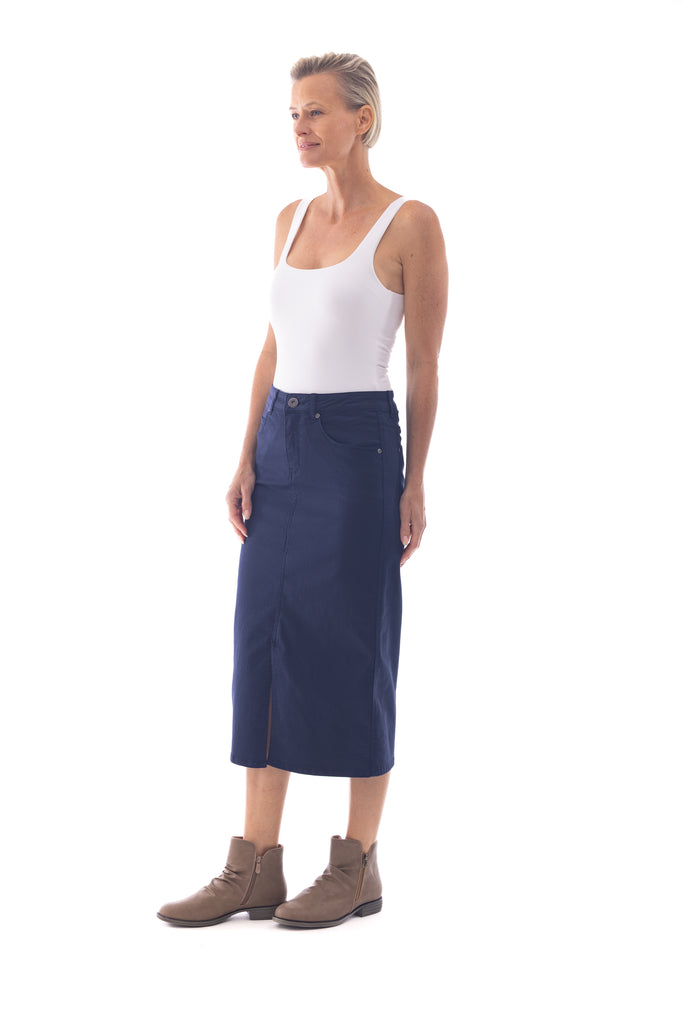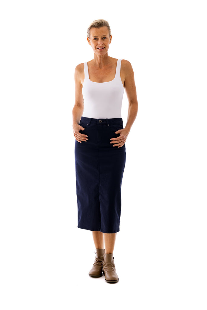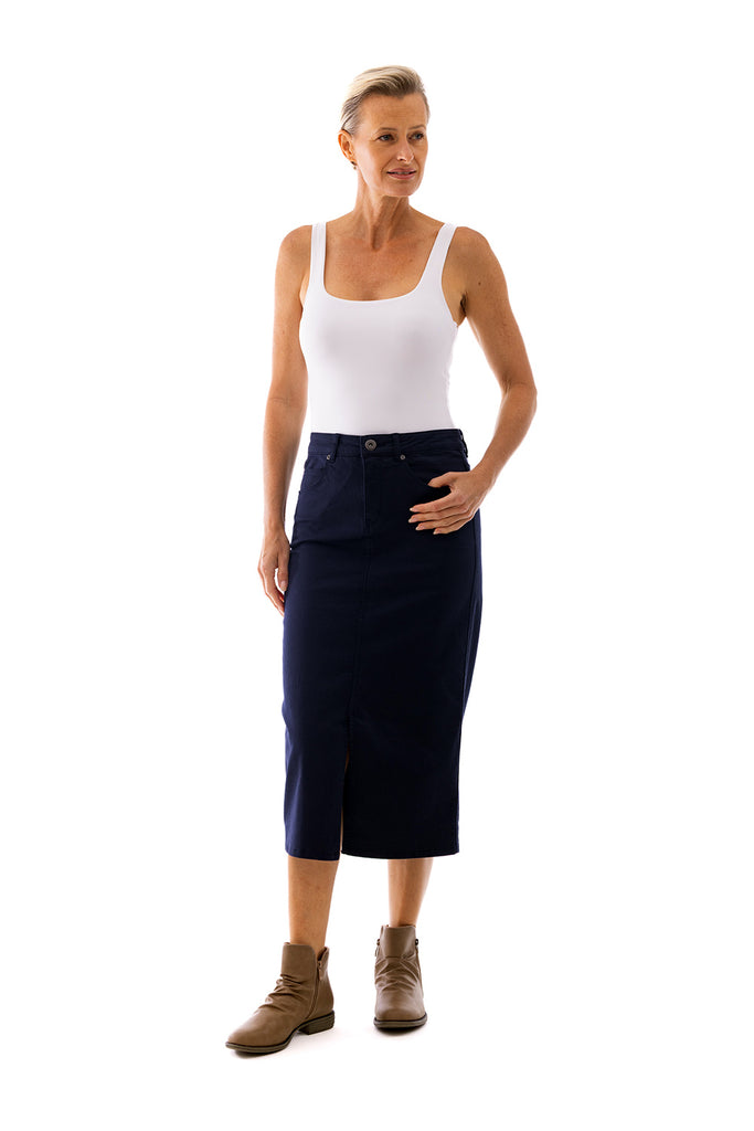 Elevate your wardrobe with the Coloured Midi Denim Skirt by Cafe Latte. Made from 97% cotton and 3% spandex, this midi length jean skirt features a front split and adds a touch of bold color to any outfit. Versatile and stylish, this must-have piece effortlessly combines fashion and function. Dress it up or down for any occasion and exude elegance and sophistication.
