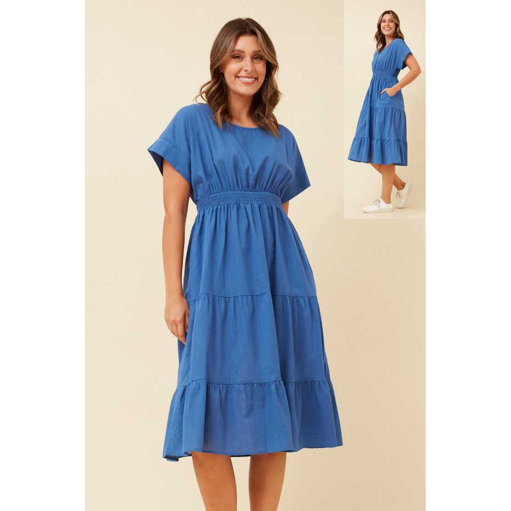 Effortlessly elegant, this cotton short sleeve dress combines timeless style with everyday practicality. Crafted from breathable cotton, it offers comfort for warm weather while maintaining a polished appearance. The thoughtfully placed pockets add functionality without compromising the dress's refined silhouette. Available in a versatile blue shade, this piece transitions seamlessly from casual outings to relaxed social occasions. A wardrobe essential that balances sophistication with wearability.
