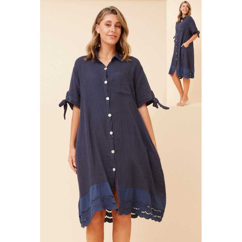 Effortless elegance meets timeless style with this navy linen dress. The breathable linen fabric provides comfort for warm weather, while delicate lace trim at the hem adds a refined, feminine touch. Perfect for casual outings or dressed up for special occasions, this versatile piece transitions seamlessly from day to evening. The classic navy hue pairs beautifully with any accessory, making it an essential addition to your wardrobe.