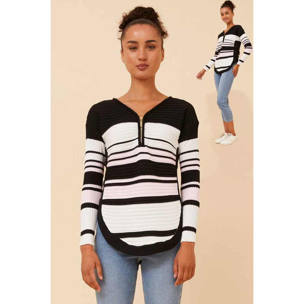 Rib Knit Button Detail Jumper - Black / Pink