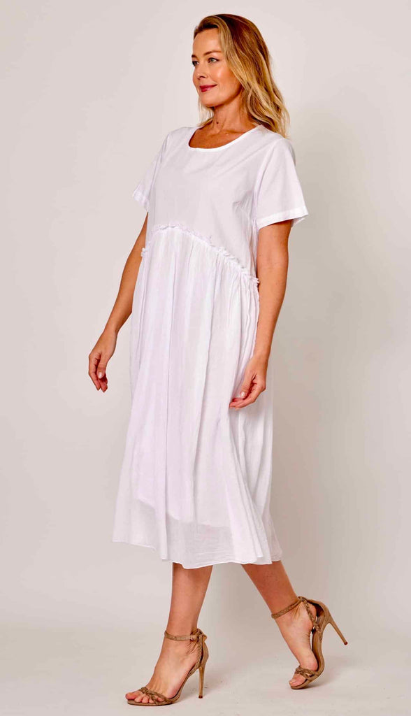 Meet your new go-to dress! This crisp white cotton number features a chic empire waistline that's seriously flattering, plus a clever button-up back that adds personality to every wear. Whether you're grabbing coffee, heading to brunch, or just living your best casual life, this versatile piece has you covered. Soft, breathable, and endlessly stylish—what's not to love?