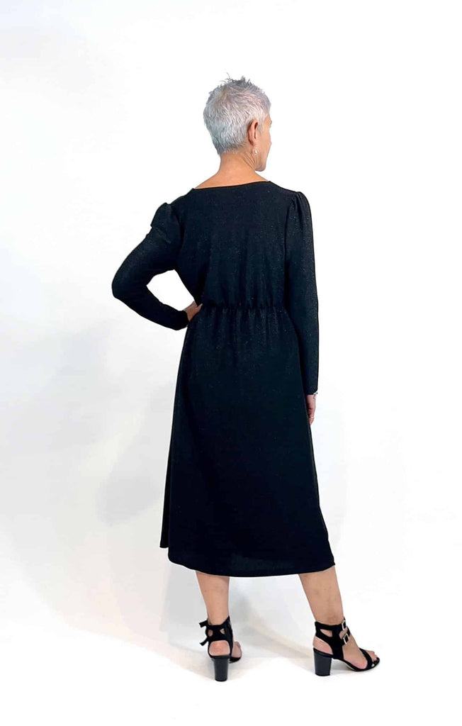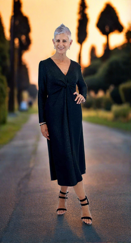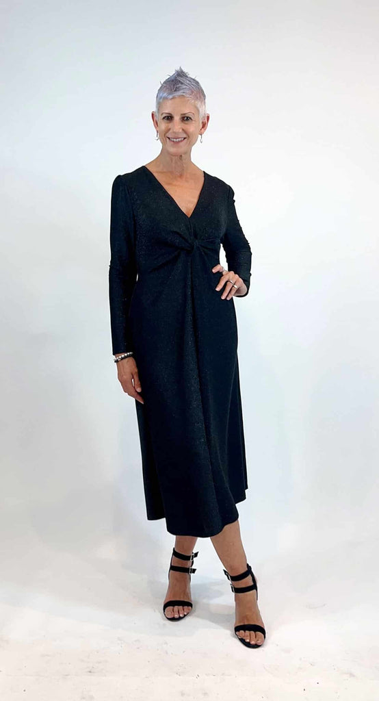 This knotted shinning dress is made of 97% polyester and 5% elastane for maximum comfort. The elegant black colour adds a touch of sophistication to any outfit. Perfect for any occasion, this dress is sure to turn heads and make a statement.
