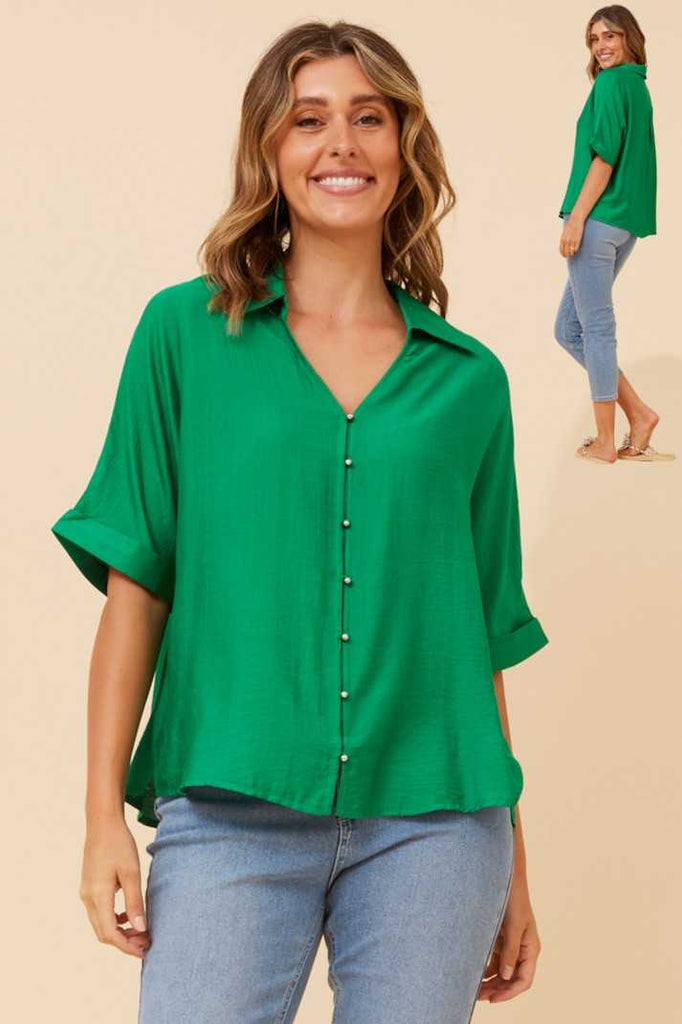 Effortless style meets everyday comfort in this jade button-through shirt. Perfect for layering or wearing solo, the short sleeves keep things breezy while the classic button front adds a touch of timeless charm. Whether you're dressing up for brunch or keeping it casual, this versatile piece transitions seamlessly from day to night. A wardrobe essential that works as hard as you do.