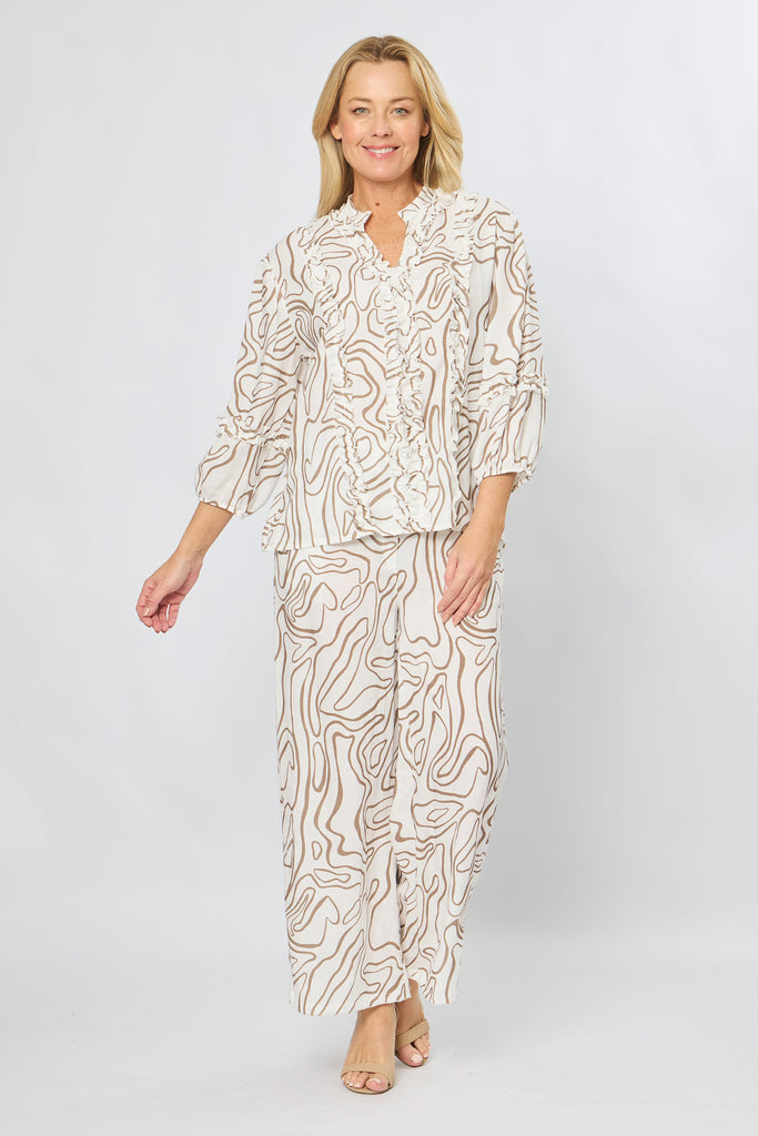 Crafted from a refined blend of linen and viscose, these Italian-made pants feature an understated geometric pattern in crisp white and warm mocha tones. The natural breathability of linen combined with viscose's fluid drape creates an effortlessly elegant silhouette perfect for elevated everyday wear or sophisticated occasions.