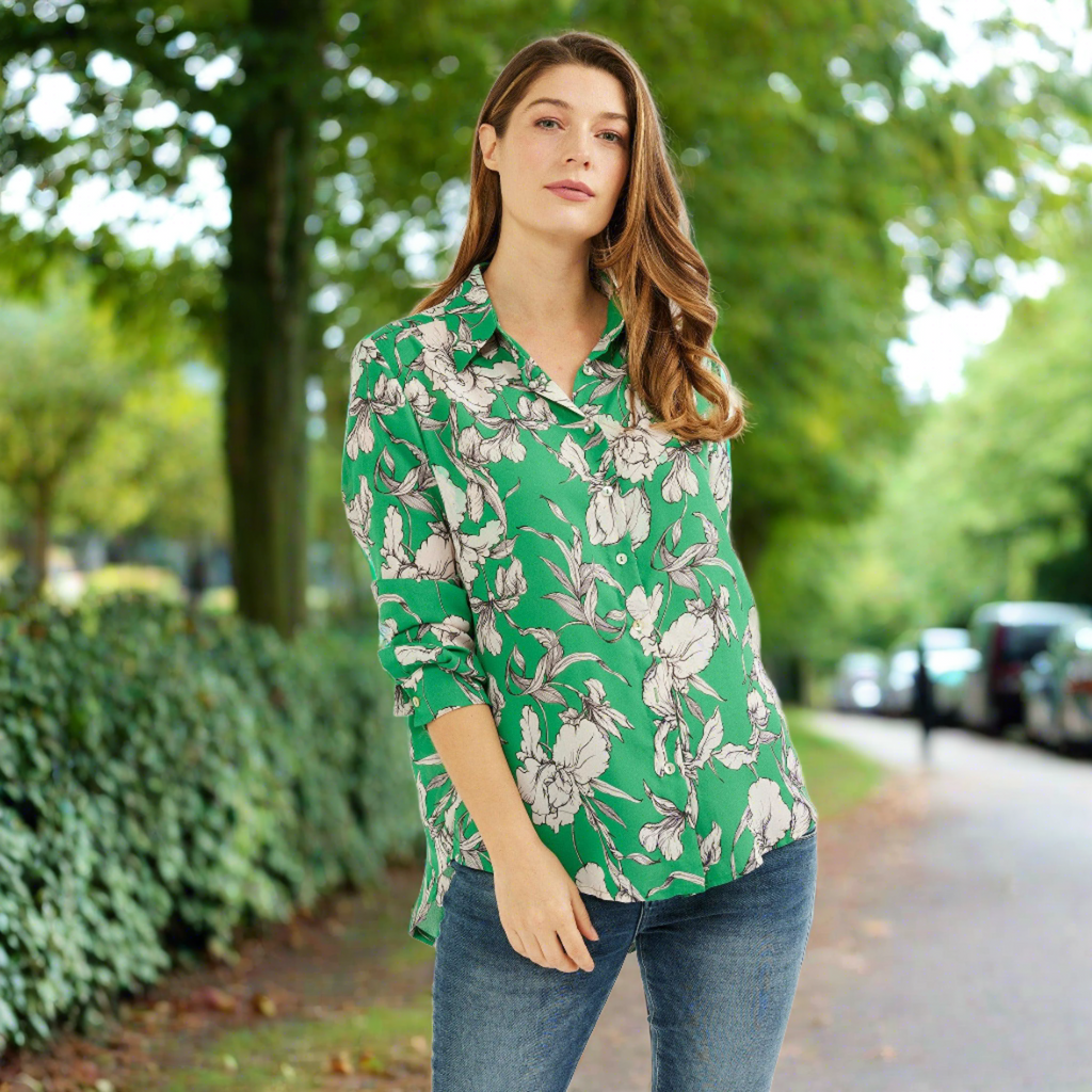 Some freshness for Spring! The Zigi shirt from 365 Days is simply gorgeous!  A timeless yet on trend piece that suits every occasion yet so practical and very comfortable!  Featuring a custom design floral print with a green body and subtle pearl buttons.   Perfect for the office, lunch or dinner out or a party.  SO versatile!  Perfect with denim, white pants or a skirt... Light weight chiffon fabric.  Pair it up with the matching Zigi skirt! Sizing is generous.