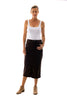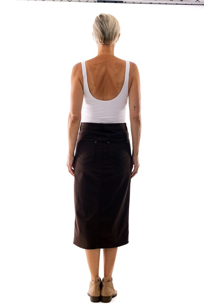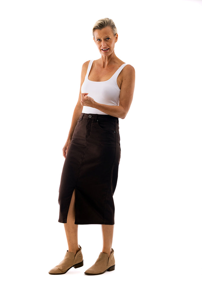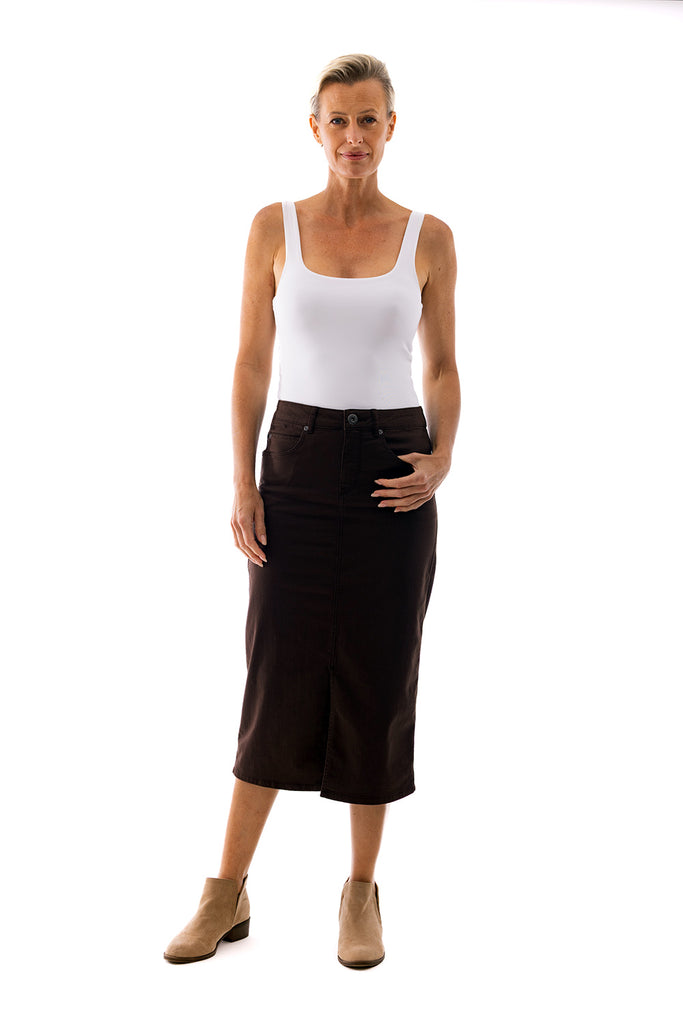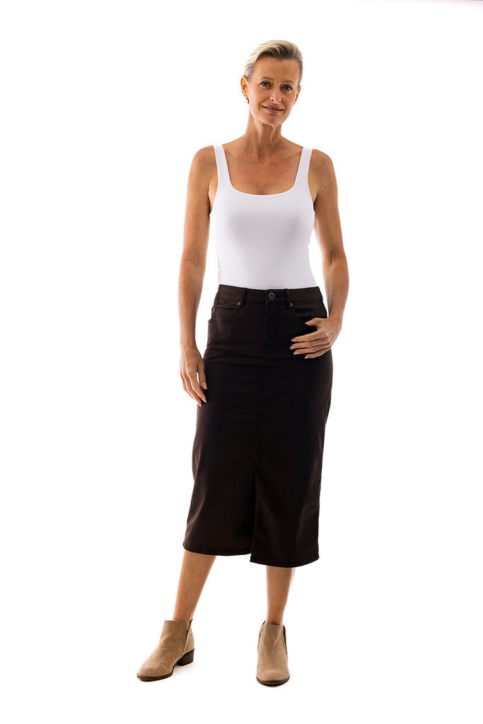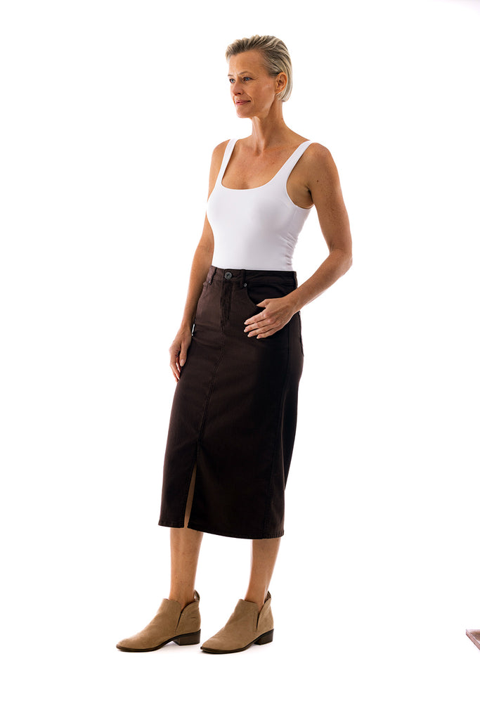 Elevate your wardrobe with the Coloured Midi Denim Skirt by Cafe Latte. Made from 97% cotton and 3% spandex, this midi length jean skirt features a front split and adds a touch of bold color to any outfit. Versatile and stylish, this must-have piece effortlessly combines fashion and function. Dress it up or down for any occasion and exude elegance and sophistication.