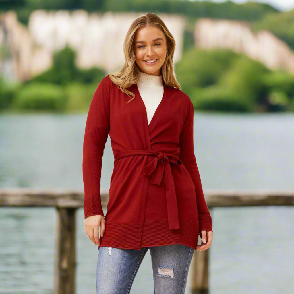 Solid Tie Waist Cardigan - Burgundy