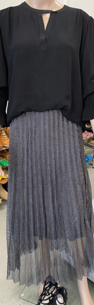 Elevate your style with our Metallic Mesh Skirt in Silver. Its stunning design exudes sophistication and exclusivity, making you stand out in any crowd. The intricate mesh fabric adds a touch of luxury, perfect for a glamorous look. Elevate your wardrobe with this statement piece.